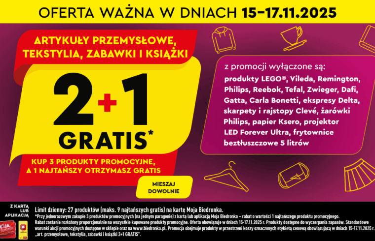 Biedronka15/11/2025 Biedronka: książki 2+1 gratis Promocja na książki w Biedronce: 2+1. Kupujemy 3 książki i jedną z nich (najtańszą) dostajemy gratis. * Rodzaj promocji: 2+1 gratis Czas trwania: do 17.11.2025 r. Skorzystaj z promocji ~~ wpis zawiera linki partnerskie (afiliacyjne) 🙂