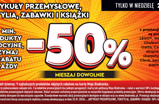 Tylko w niedzielę (jest handlowa) książki w Biedronce 50% taniej. Obowiązuje przy zakupie minimum 3 książek (limit: 9) Przejdź do promocji
