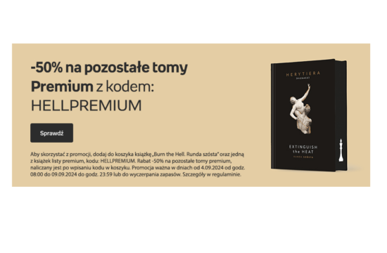 Aby skorzystać z promocji na serię Trylogia Hell, dodaj do koszyka książkę „Burn the Hell. Runda szósta” P.S. Herytiera (pizgacz) oraz jedną z książek z listy tomów serii premiumoraz użyj kodu: HELLPREMIUMRabat -50% na pozostałe tomy serii premium, naliczany…