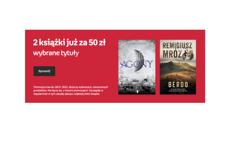 Empik29/12/2024 Empik: 2 książki za 50 zł 2 książki za 50 zł na Empik.com. Do wyboru ponad 2 tysiące tytułów, na przykład wybrane powieści Remigiusza Mroza. * Rodzaj promocji: rabaty do 45% Czas trwania: do 28.01.2025 r. / do wyczerpania zapasów promocyjnych Skorzystaj z promocji