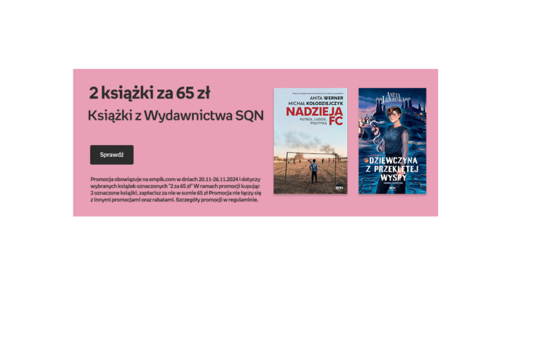 Empik25/11/2024 Empik.com: 2 książki wyd. SQN za 65 zł Na Empik.com kupimy 2 książki wyd. SQN za 65 zł. Wybierać można z ponad 100 tytułów. * Rodzaj promocji: 2 książki za 65 zł Czas trwania: do 26.11.2024 r. Skorzystaj z promocji
