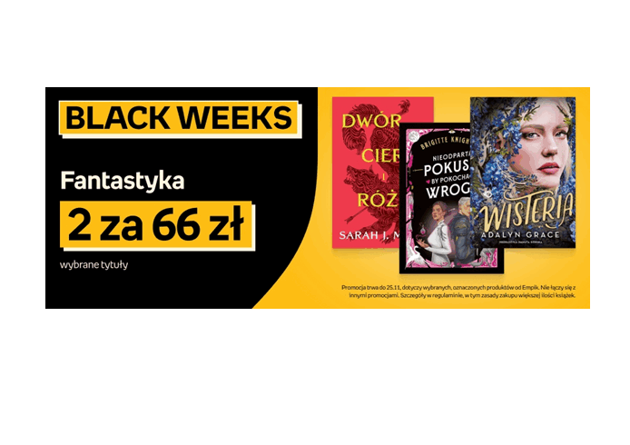 Empik15/11/2025 Empik: fantastyka – 2 książki za 66 zł 2 książki za 66 zł na Empik.com w ramach Black Weeks. Do wyboru blisko 40 tytułów. Na przykład: * Rodzaj promocji: 2 książki za 66 zł Czas trwania: do 25.11.2025 r. Skorzystaj z promocji ~~ wpis zawiera linki partnerskie (afiliacyjne) 🙂 TAGS: Black FridayBlack WeeksfantastykaKsiążki fantasy
