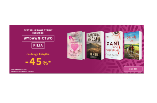 Co druga książka Wydawnictwa Filia o 45% taniej w Matrasie. Rabat naliczy się w koszyku, na tańsze tytuły. *Rodzaj promocji: rabaty 45%Czas trwania: do 9.06.2024 r.Skorzystaj z promocji