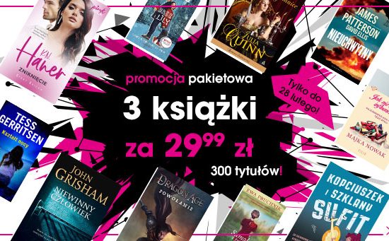 W księgarni Świat Książki trwa promocja, w której kupimy 3 książki za 29,99 zł. Wybierać można z około 300 tytułów. Przykładowy zestaw: *Rodzaj promocji: 3 książki za 29,99 złCzas trwania: do 28.02.2022 r.Skorzystaj z promocji