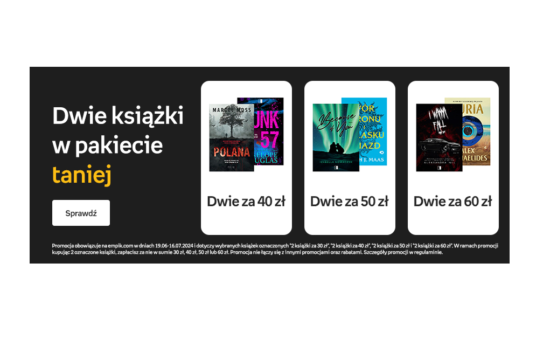 Na Empik.com kupimy 2 książki taniej - w promocyjnych pakietach, które sami możemy stworzyć. Możemy wybrać 2 książki za 30 zł, 2 książki za 40 zł, 2 książki za 50 zł lub 2 książki za…