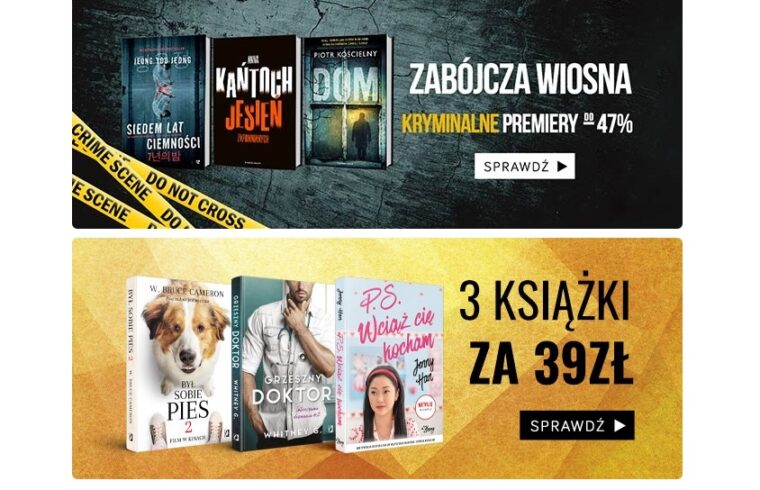 TaniaKsiazka.pl29/04/2022 Tania Książka: kryminalne premiery do -47%, 3 książki za 39 zł W księgarni Tania Książka trwają 2 ciekawe promocje. Kryminalne premiery z rabatami do 47%. *Rodzaj promocji: rabaty do 47%Czas trwania: do 3.05.2022 r.Skorzystaj z promocji Możemy też stworzyć sobie fajne pakiety – 3 książki za 39 zł. *Rodzaj promocji: 3 za 39 złCzas trwania: do 3.05.2022 r.Skorzystaj z promocji